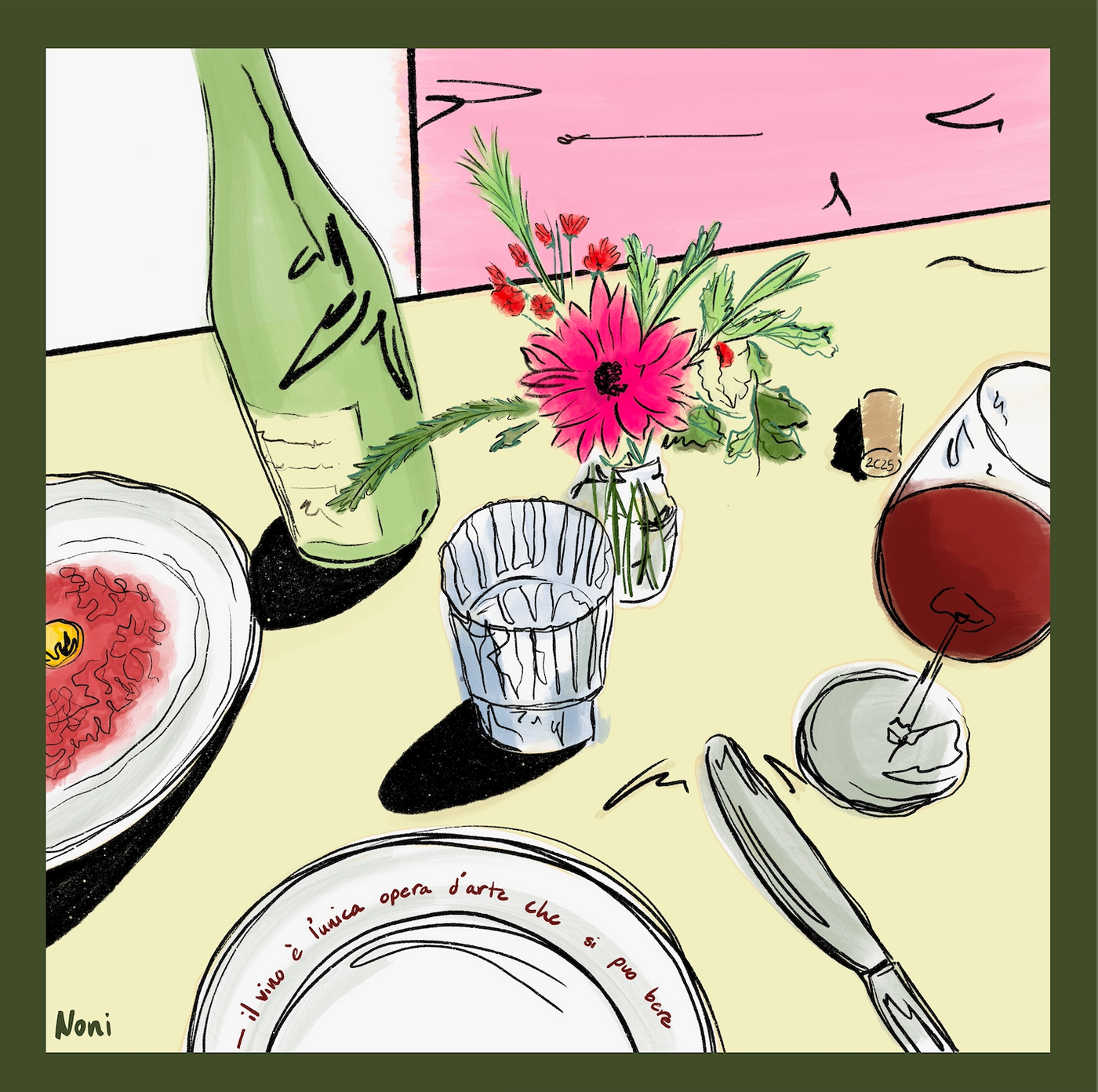 A little aperitivo moment—wearable. The Festa di Cena Scarf features an artistic hand-drawn table scene with a wine bottle, florals,...